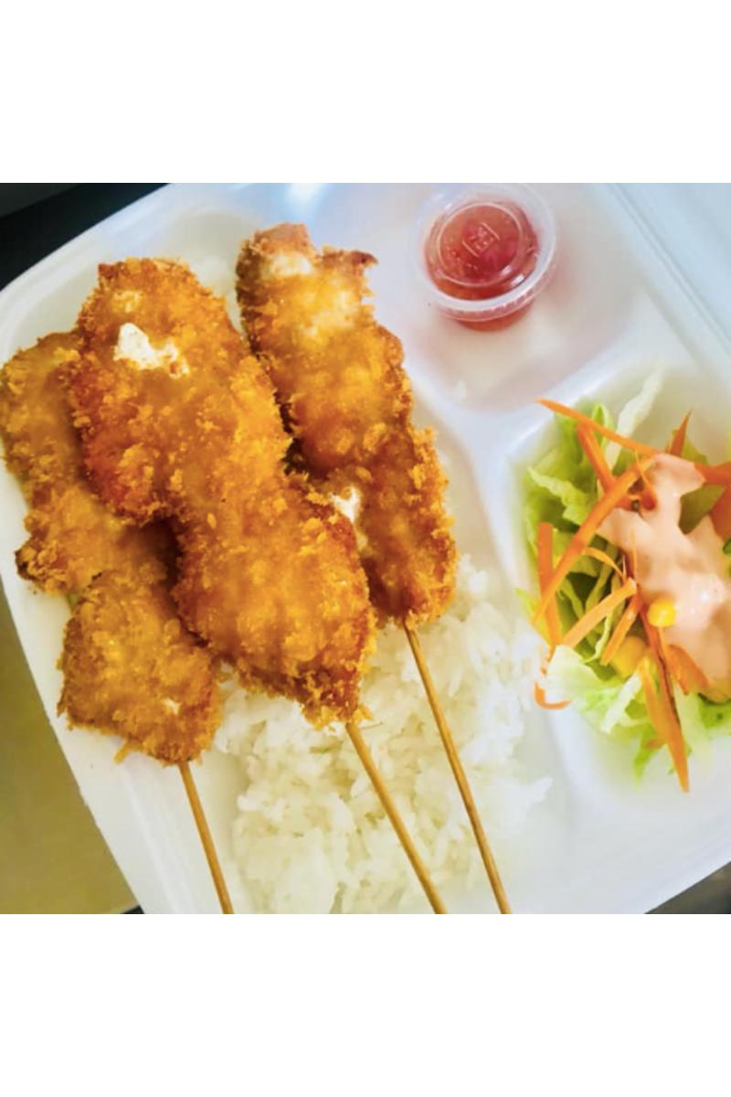 3 friterte kyllingspyd med ris og salat.